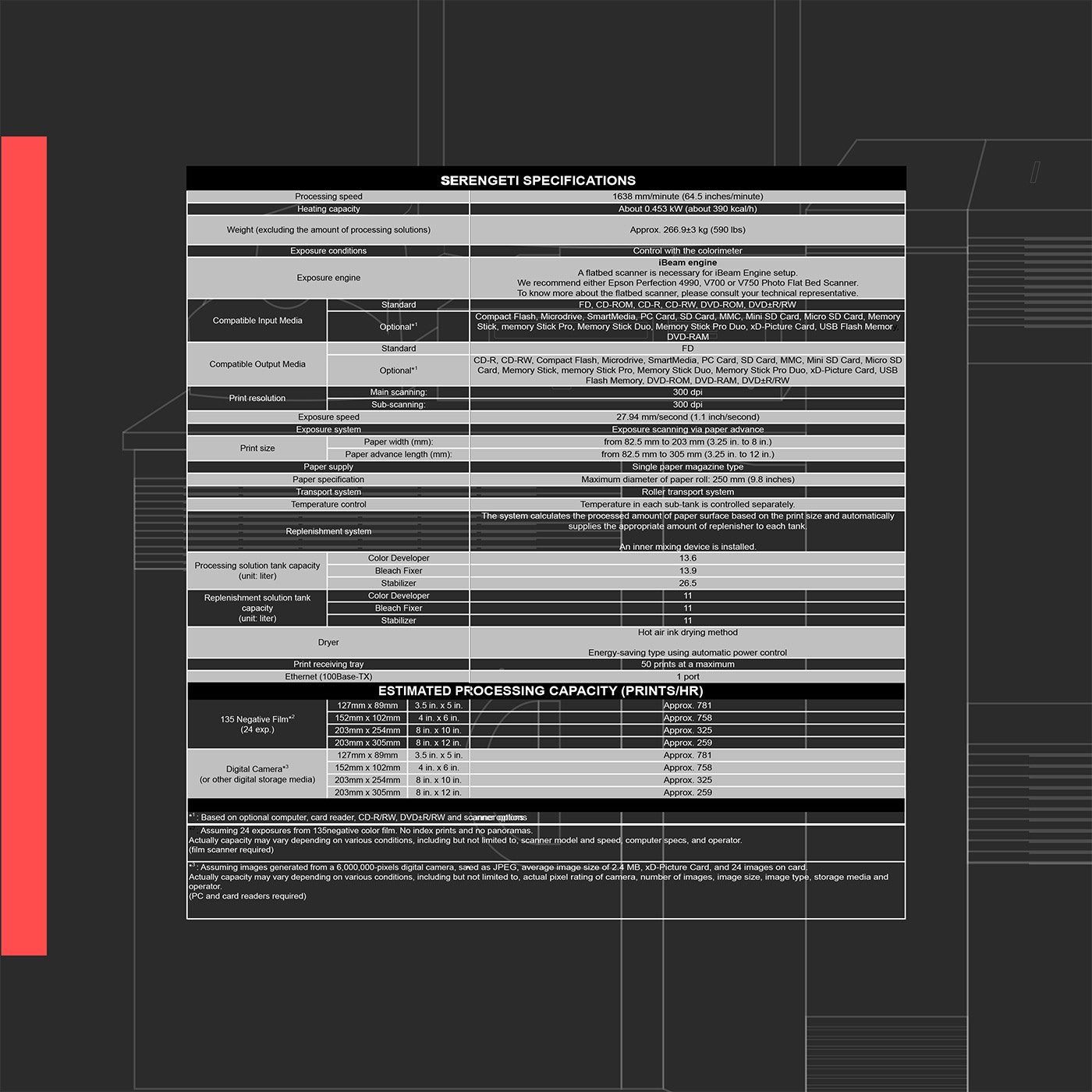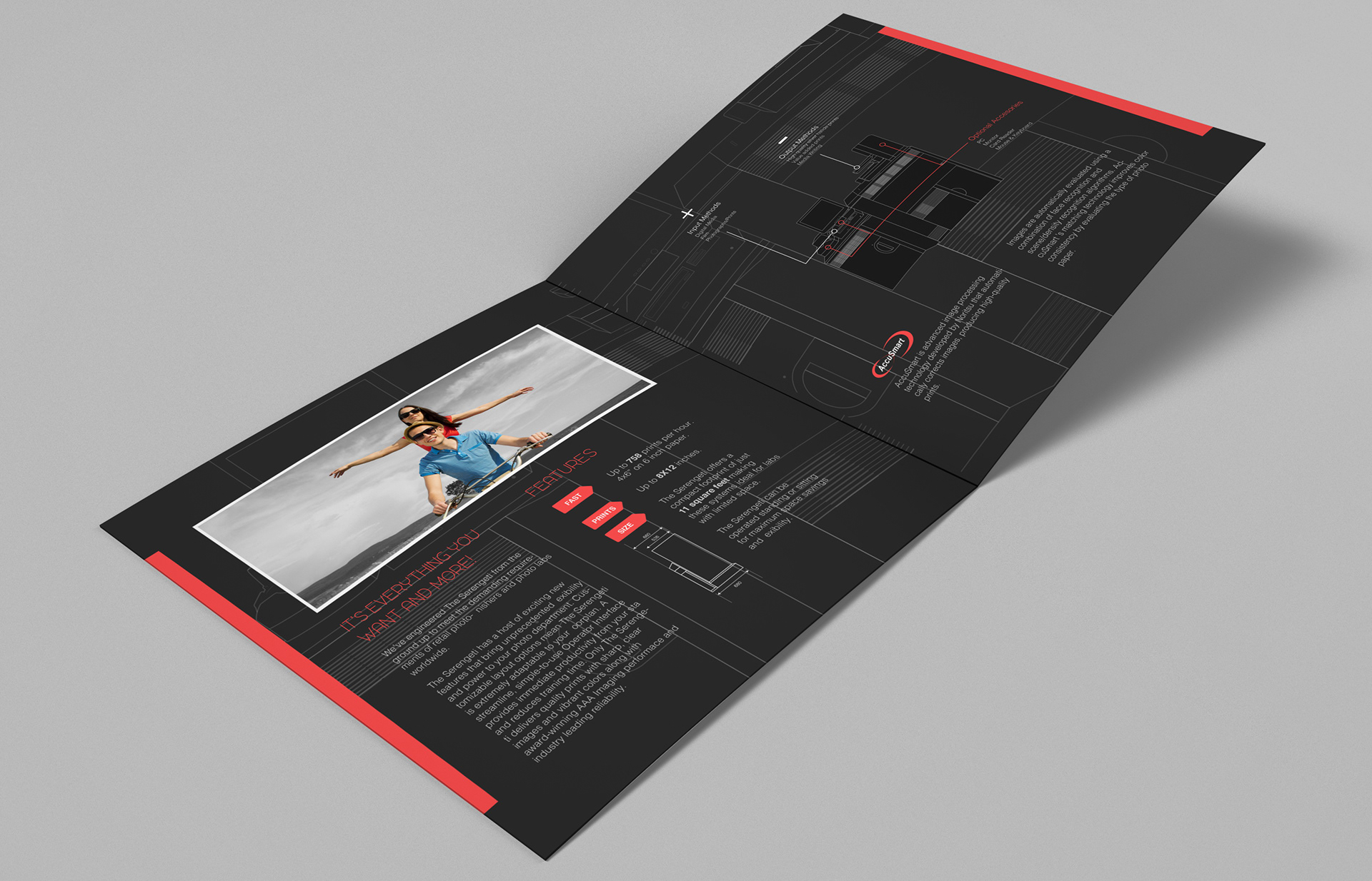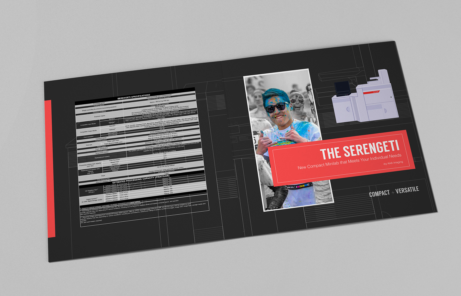 This 4 page brochure was created for a piece of photo printing equipment. It contains product information, technical specifications and photos.